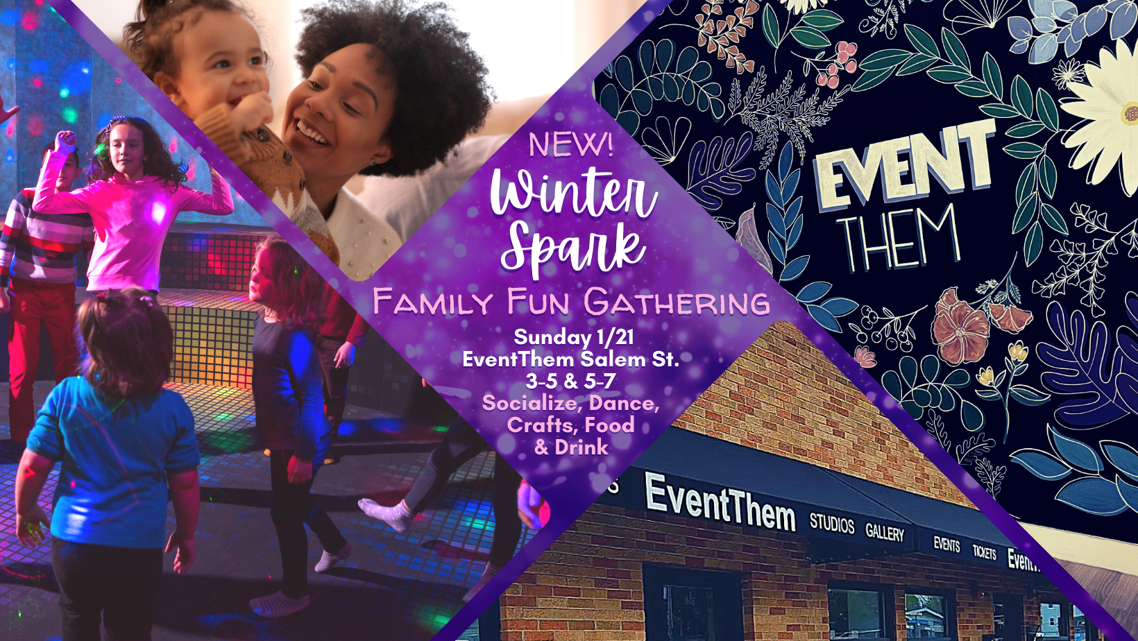 EventThem Studios 344 Salem Street, Medford, MA, United StatesDiscover a fresh way to connect families in Medford and let kids unleash their energy on winter afternoons! Join us for “Winter Spark: Family Fun Gathering” at EventThem, a new vibrant event and collaboration space situated on Salem St, Medford, on Sunday, 1/21. Experience a delightful dance party and dive into creative crafts lead by local volunteers. It’s fun family evening to ignite sparks with other families and build cherished memories together! Don’t miss out on this wonderful opportunity to bring joy to your winter days!