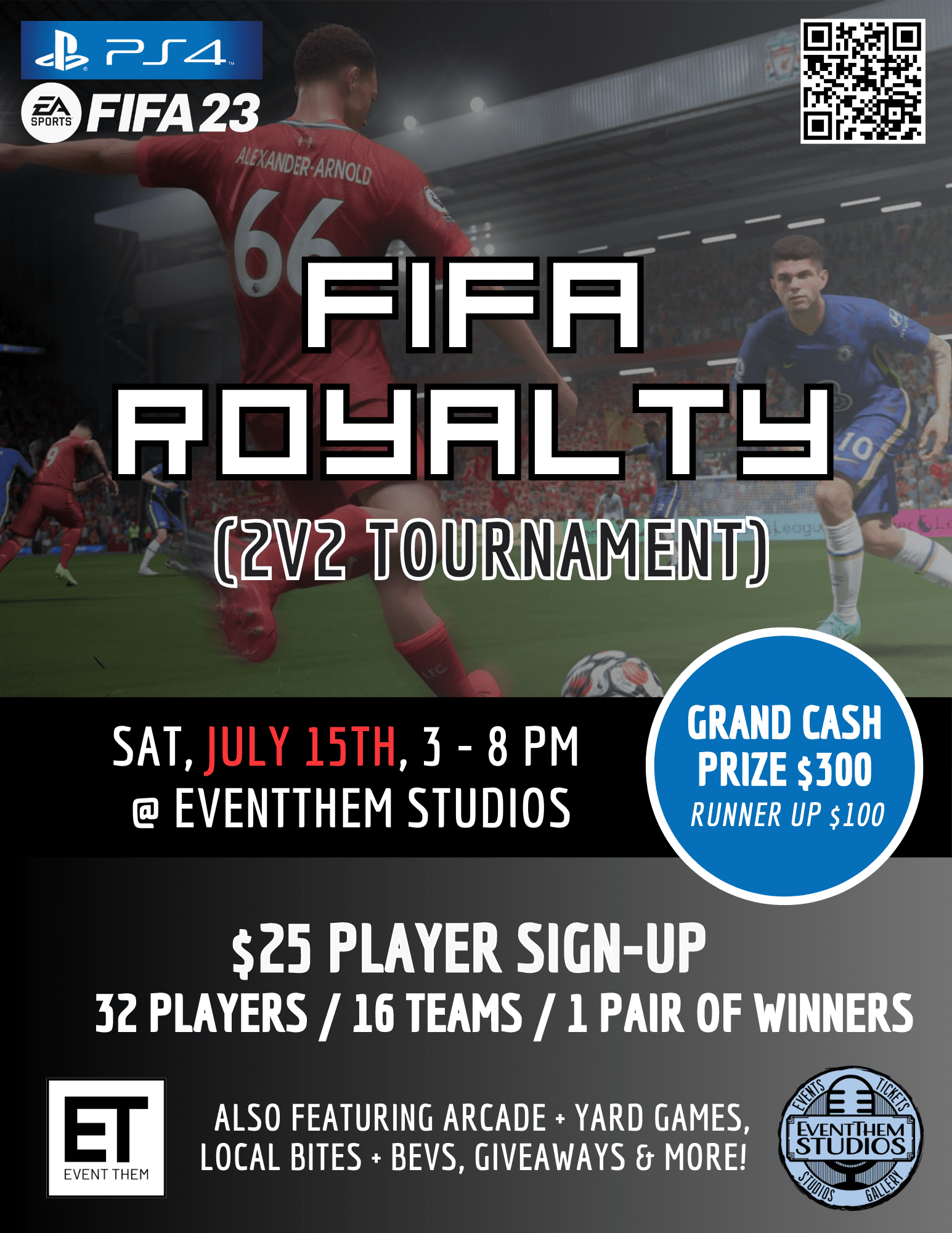 EventThem Studios 344 Salem Street, Medford, MA, United StatesJoin us for the first edition of FIFA Royalty (2v2 Tournament) at EventThem Studios for a chance to enjoy FIFA 23 on PS4, arcade games, yard + board games, music, local bites + beverages, giveaways & more!