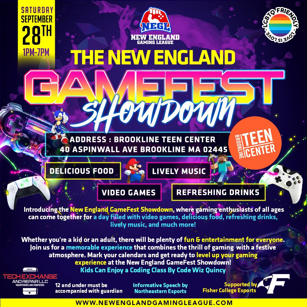 Experience the New England GameFest Showdown on Sept 28, 1 PM - 7 PM at Brookline Teen Center. Don't miss this exciting event!